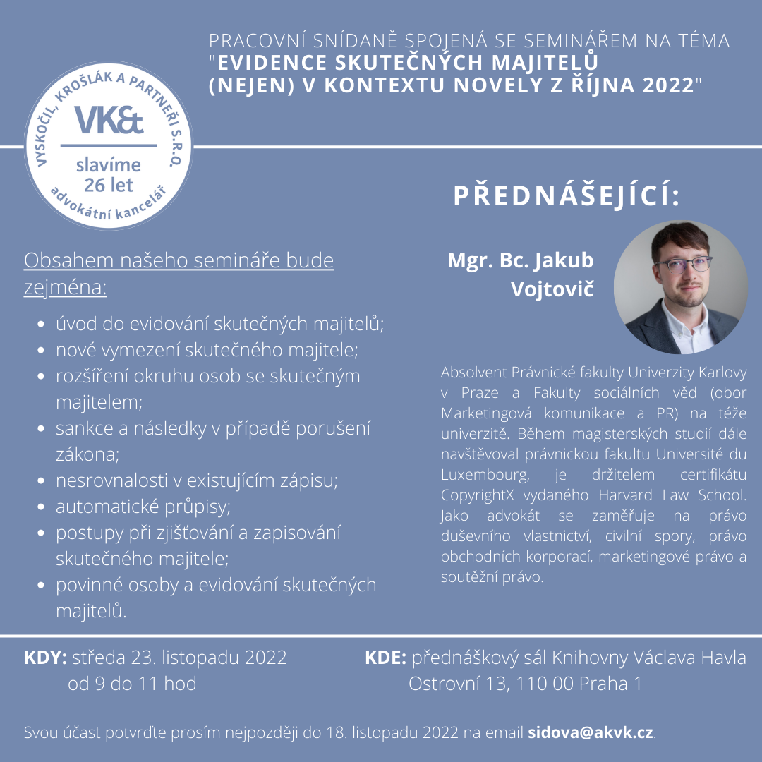 Vyskočil, Krošlák a partneři s.r.o., advokátní kancelář si Vás dovoluje pozvat na pracovní snídani spojenou se seminářem: „EVIDENCE SKUTEČNÝCH MAJITELŮ (NEJEN) V KONTEXTU NOVELY Z ŘÍJNA 2022".